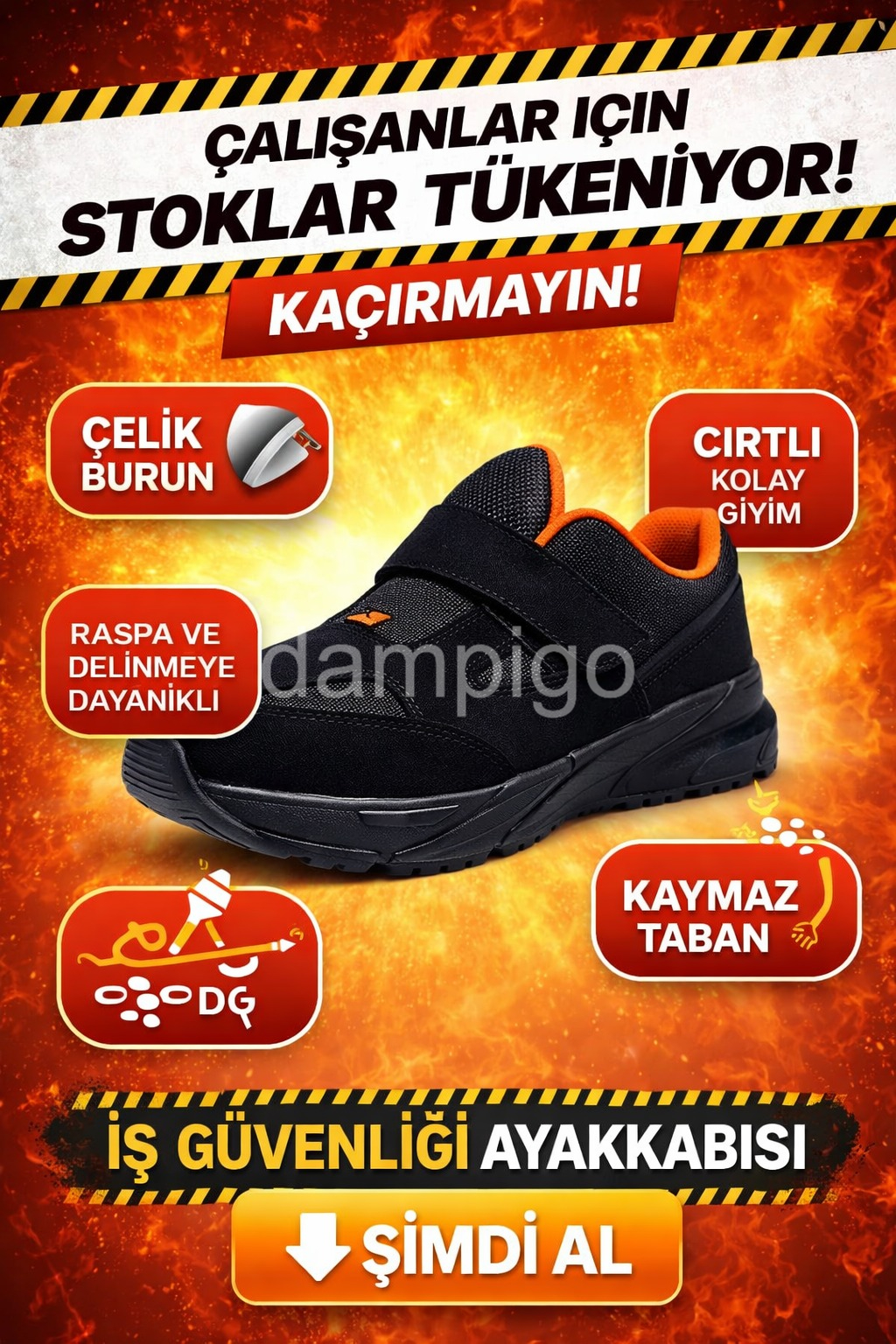 Dampigo’da sunduğumuz 200 Joule – 1500 N Darbe Dayanımlı Çelik Burun Koruyucuya sahip iş güvenlik ayakkabıları ile ayaklarınız her zaman güvende!